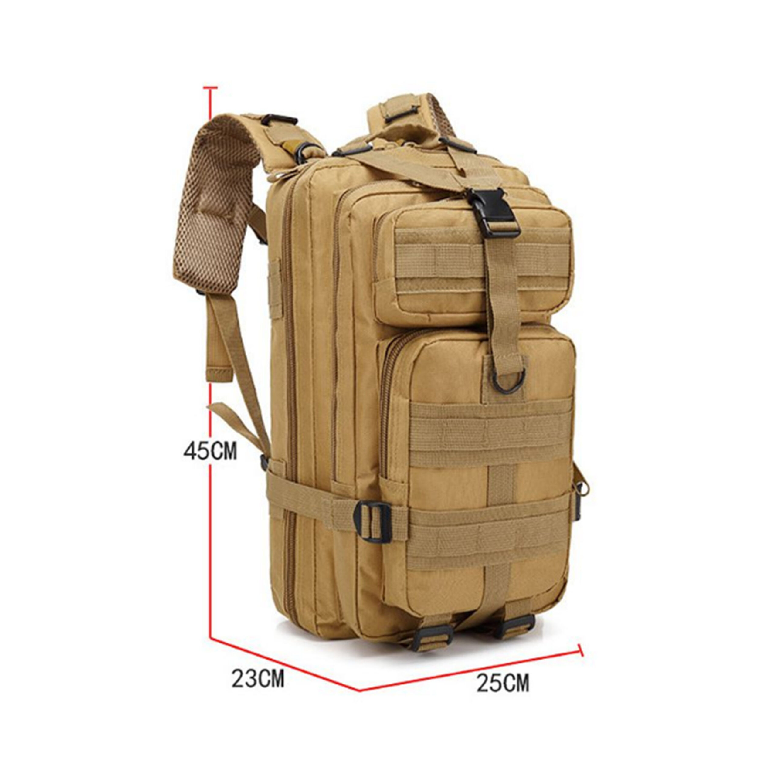PARAMS –backpack capacity approx.30L. Size approx. 25*45*15CM (W*H*L), it’s small backpack; backpack is made of high-density fabric-durable and water-resistant.