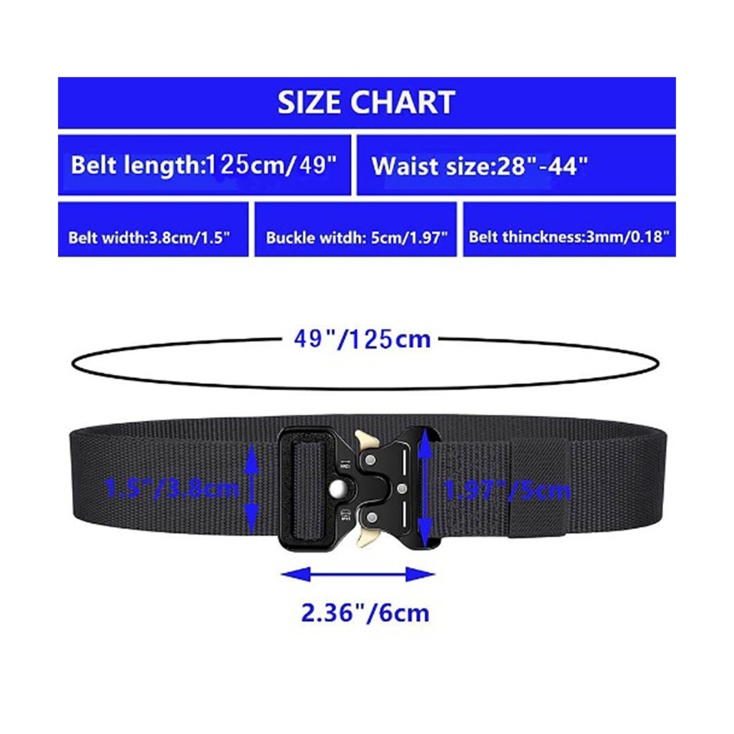 Length: 49″(125cm), Width:1.5”(3.8cm), fits waist 30″~ 36″. Buckle Size: 2.4″(6cm) in width and 5/16″(8mm) in thickness. The buckle cannot get through normal pants loops, please take off the buckle before getting it through.